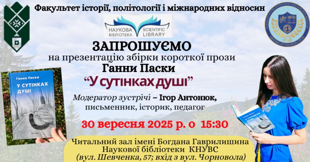 30 вересня 2025 року о 15.30 у читальному залі імені Богдана Гаврилишина Наукової бібліотеки Карпатського національного університету імені Василя Стефаника відбудеться культурно-науковий захід — презентація книги «У сутінках душі» Ганни Паски, докторки філософії (PhD), письменниці, наукової співробітниці Івано-Франківського краєзнавчого музею.
