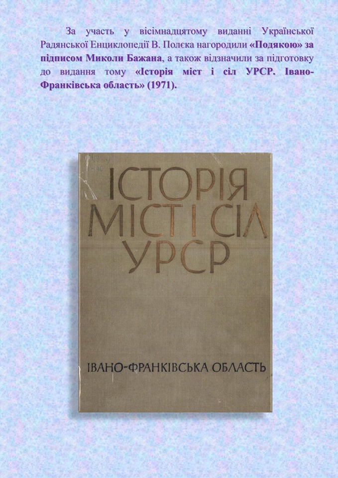 Професор долучився до створення сімнадцятитомного видання УРЕ, до видання одного з томів “Історія міст і сіл УРЕ. Івано-Франківська область” (1971), за що отримав “Подяку” за підписом М. Бажана.