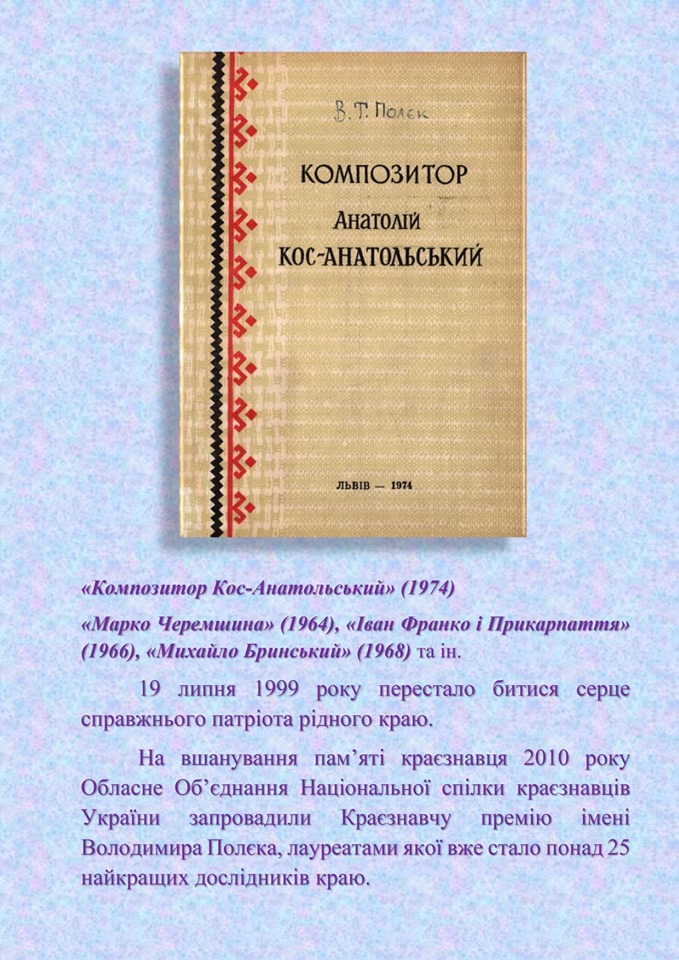 - 2.Біографічна довідка про Володимира Теодоровича Полєка // Краєзнавець Прикарпаття. – 2010. – № 15. – С. 8.